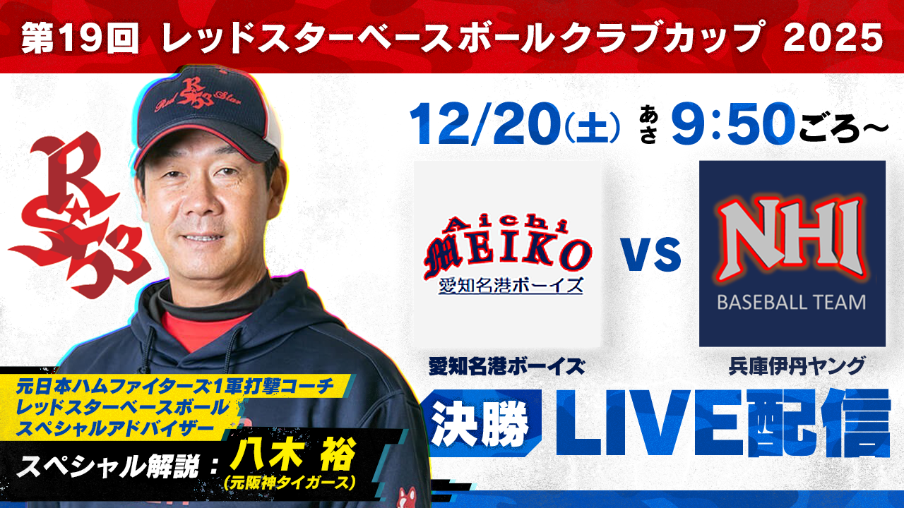 | 放送前 | 野球 【LIVE】第19回レッドスターベースボールクラブカップ2025<決勝戦 愛知名港ボーイズ vs 兵庫伊丹ヤング> | 2025年12月20日 09:50〜 |